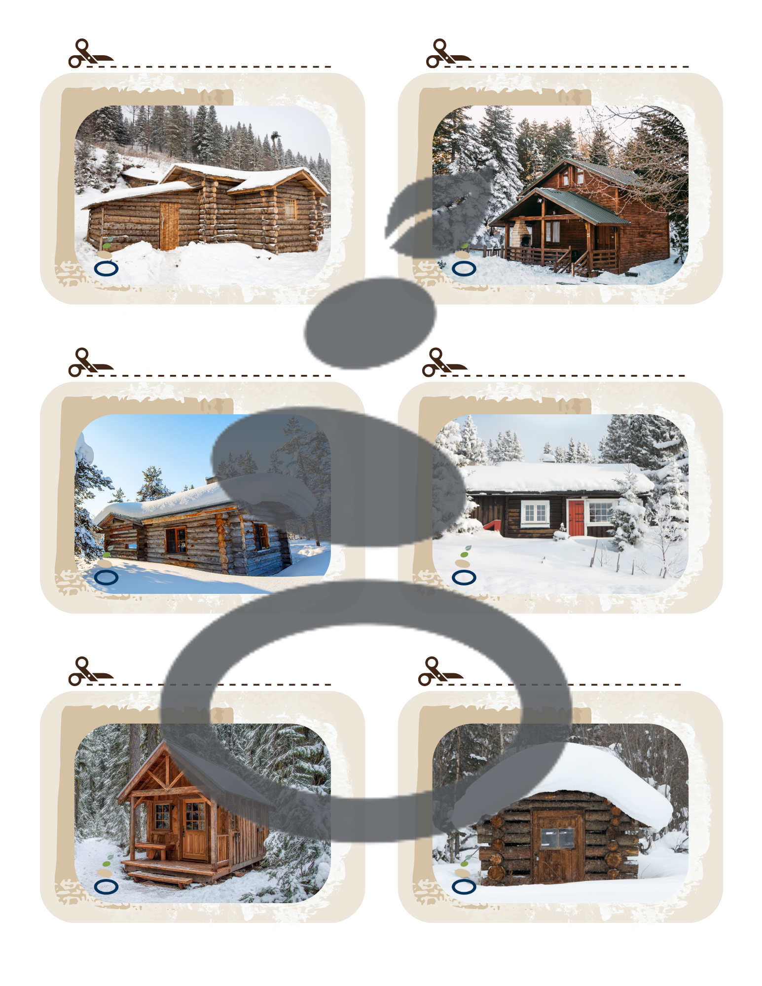 6 real life photos of cozy winter cabins for block area enhancement. Use these images and adhere to blocks to add to your block area or tough tray!