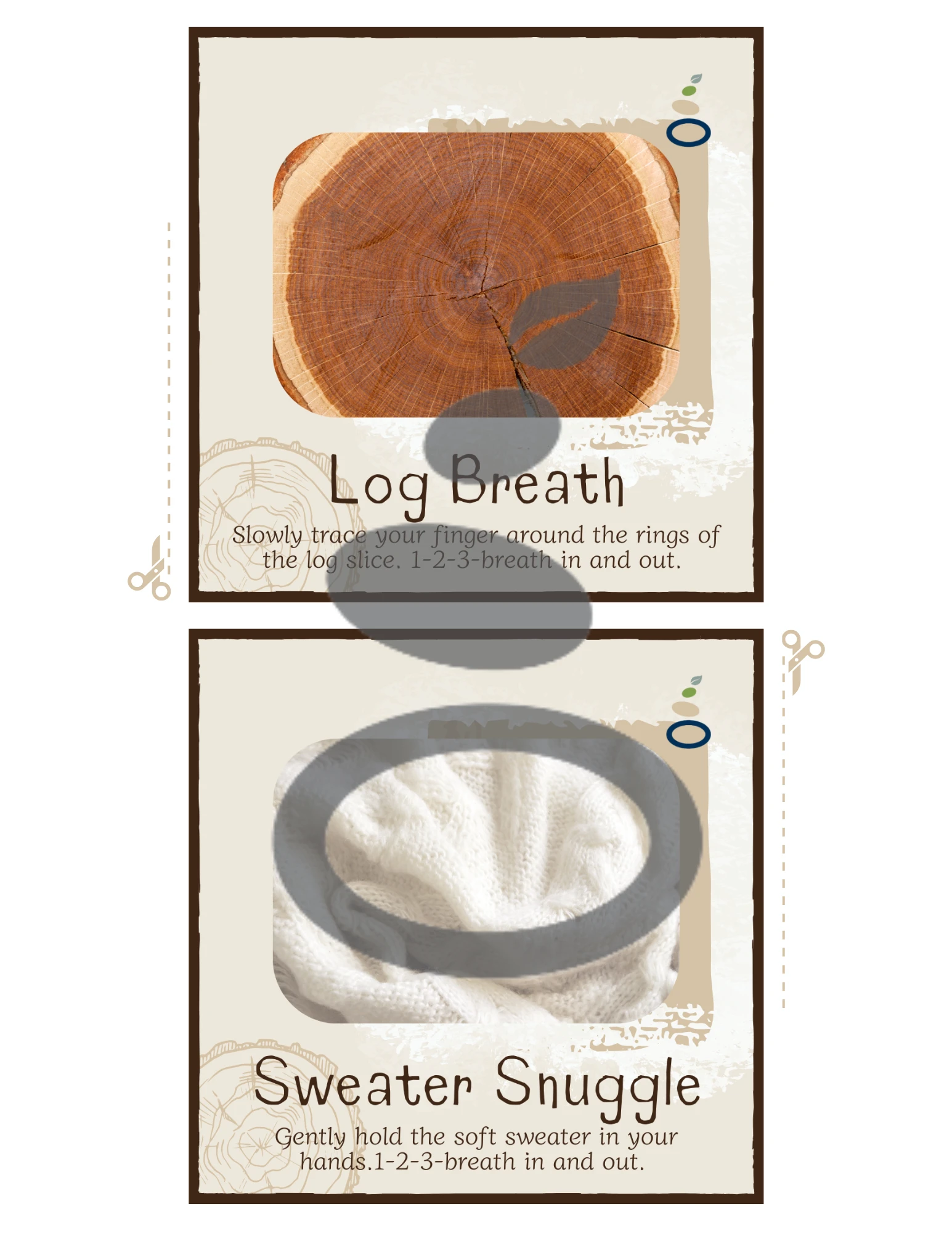Grab this cozy cabin breathing set to help enrich your social emotional lesson plans. This set includes 6 laminated breathing prompt cards on a ring with laminated “ways to play” for teaching, sealed natural wood slice, soft felted “sweater” texture, mini enamel mug for coca clam and hand painted fire block.