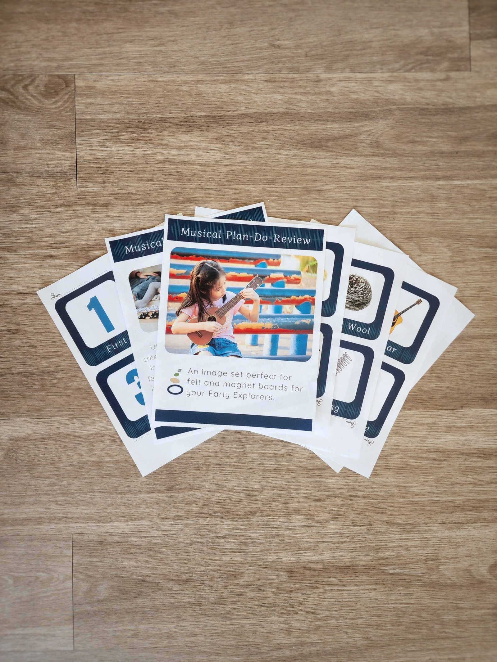 Utilize this set to encourage children to create a visual step-by-step plan within their Instrument repair shop. Adhere images to felt, magnet adhesive, or wooden tiles. Place in a low basket near a felt or magnet board along with the number indicators 1-2-3. Works well with other curriculums.