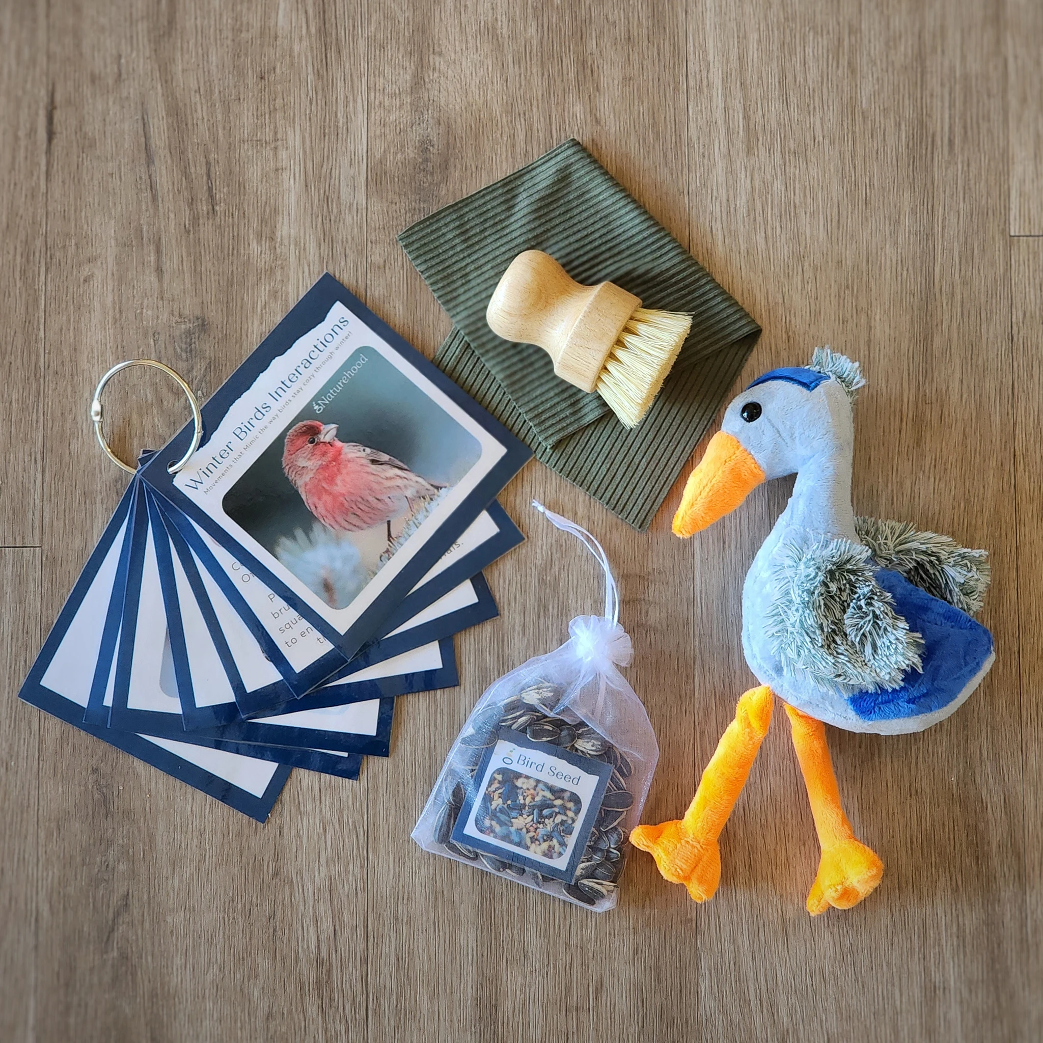 This set is all about teaching important independent care skills. By caring for these birds, you will be opening conversation to important basic care skills for nature’s creatures! Included are laminated prompt cards as a story and “ways to play” for the teacher, mini brush for gentle strokes like “preening”, bird seed pouch, and soft fabric “blanket” square.